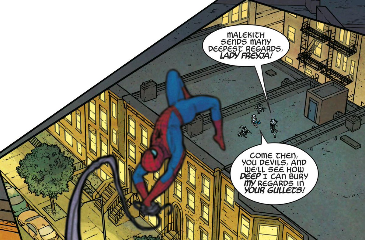 Dauterman’s Spider-Man never stands the same way twice. There's not a single neutral feet-planted pose here, and it gives Spidey this twitchy energy. It also helps establish him as out of place alongside Asgardians – note how he pops in at the bottom corner of the page.pic.twitter.com/npqNTbwJD2