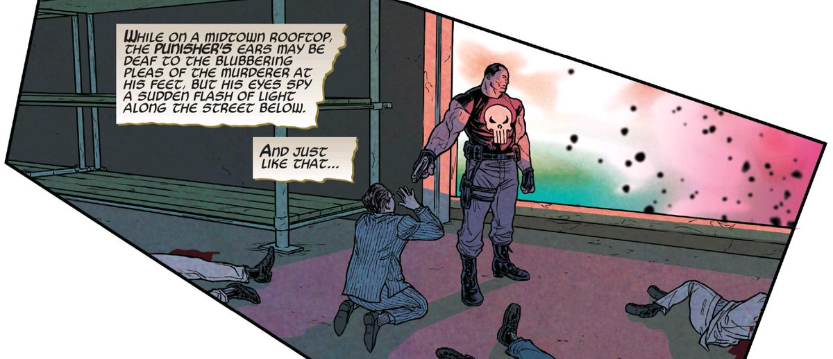 This page works to link up the disparate areas of Marvel New York, each with their own localised characters, stories and genres. This Punisher panel really breaks down those barriers, as one genre intrudes on another.pic.twitter.com/llNXaOOWAE
