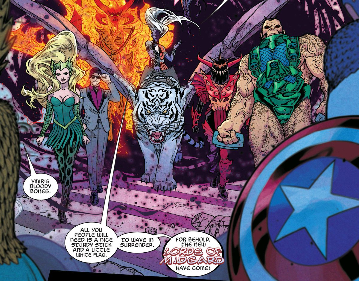 Asgardians misunderstanding heroes’ names and turning them into fantasy titles is a hoary old trope (cf. “Man of Spiders”, in this very same issue) but for some reason I love this one. CAPTAIN OF AMERICA.pic.twitter.com/v8XSiwmkXI