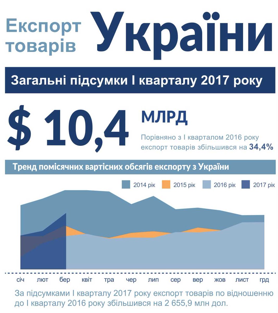 У І кварталі 2017 експорт товарів збільшився на 34,4% у порівнянні з І кварталом 2016. http://bit.ly/2roizEa .