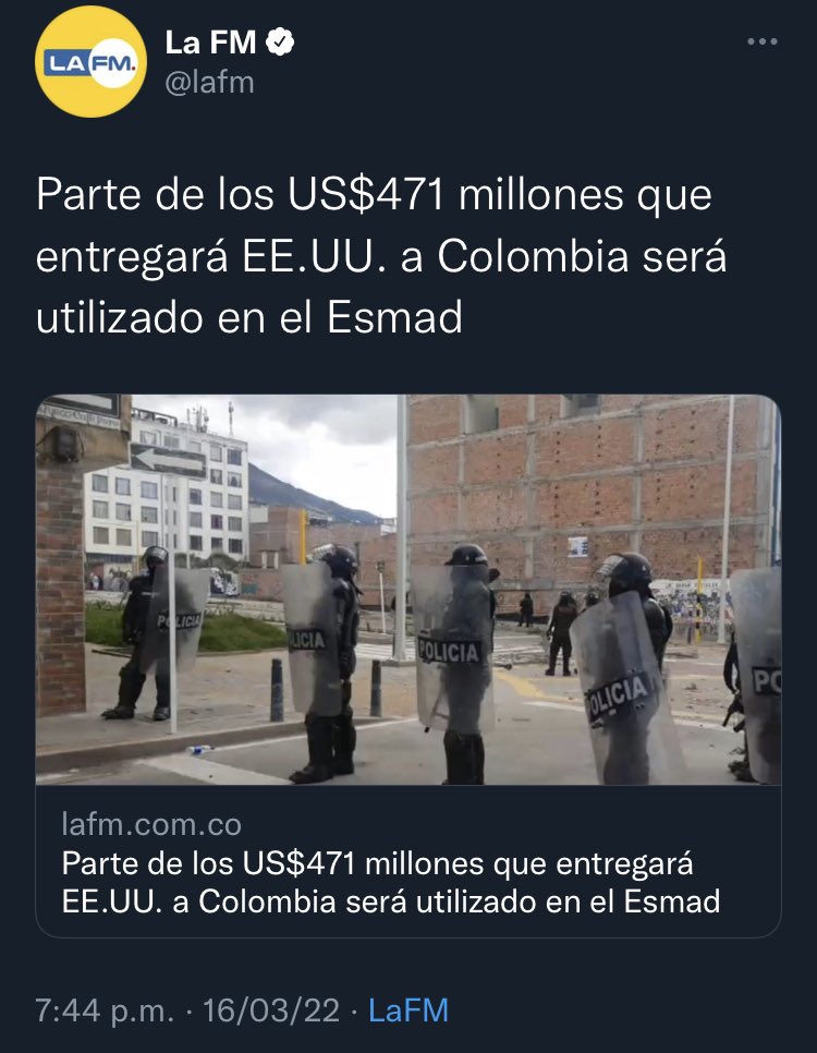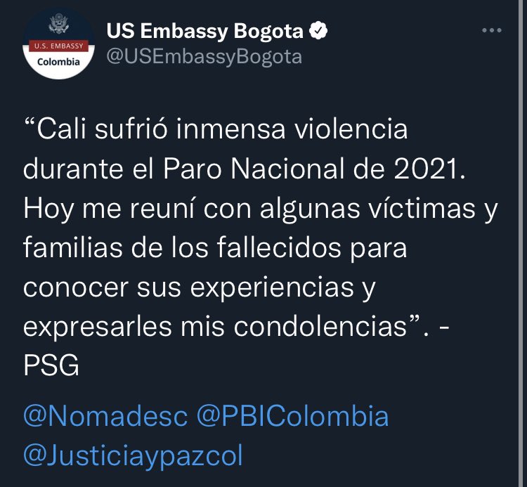 @USEmbassyBogota a la@PoliciaColombia. En el paro nacional la policía y el ESMAD cometieron más de 3.486 agresiones a los DDHH que evidencian un irrespeto a la vida y a la democracia, lo cual dista mucho de un comportamiento a felicitar.pic.twitter.com/VdgvjQ0izz
