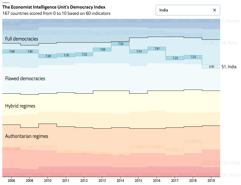 India, the world’s biggest democracy, also experienced a regression. It dropped ten places to 51st after the government stripped Jammu & Kashmir of its statehoodpic.twitter.com/BmTXJXHpge