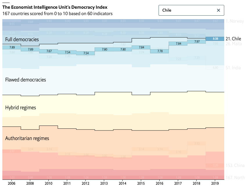 There was some good news though. Protests in Chile brought about government reforms and the promise of a referendum. It moves into the “full democracy” category for the first timepic.twitter.com/TVq2V4hw1b