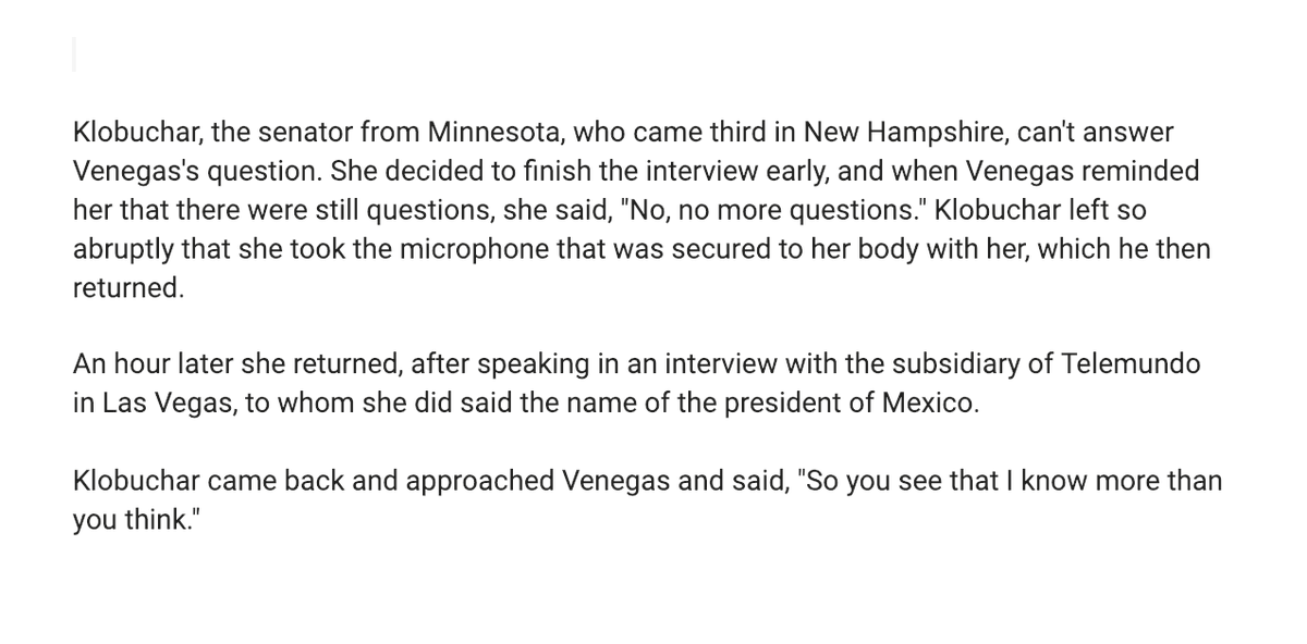 Oh boy. Telemundo write-up says Klobuchar ended the interview early (so abruptly she took her mic with her). that day, she did name AMLO in another interview and then came back to Venegas to say: "So you see that I know more than you think" https://www.telemundo.com/noticias/2020/02/14/dos-precandidatos-democratas-no-recuerdan-el-nombre-del-presidente-de-mexico-solo-tmna3696502 …pic.twitter.com/9Va56mXv1z