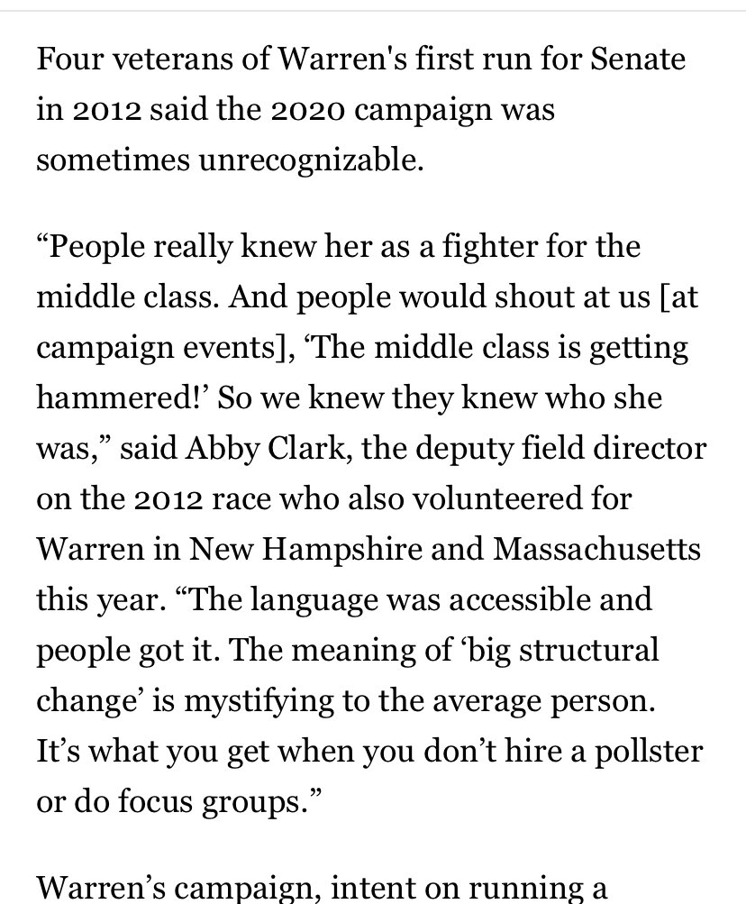Warren’s focus on Iowa and NH further contributed to her weakness w/ voters of color that never got resolved despite deliberate efforts in plans/speeches. “It just seemed we couldn’t talk to nonwhite folks,” one Warren staffer on the ground said.