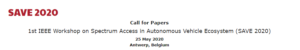 Call for Papers for the 1st IEEE Workshop on Spectrum Access in Autonomous Vehicle Ecosystem (SAVE 2020) in Antwerp, Belgium on 25 May 2020. Paper submission deadline is 15 January 2020. For more information, visit http://bit.ly/2Q6ps6W .pic.twitter.com/n0Rp4jv9Ki