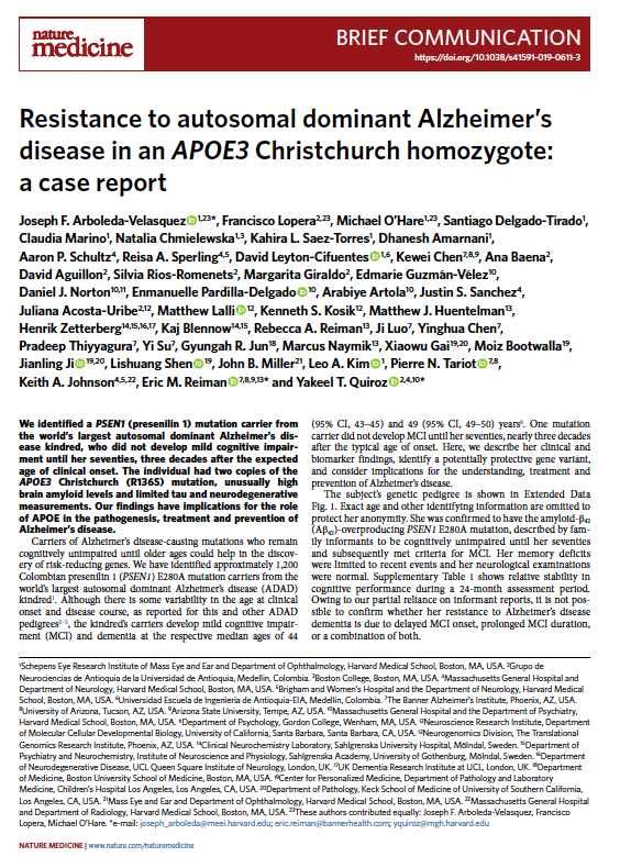 #Alzheimers: the value of sequencing people of extreme phenotypes, resistant to penetrance@NatureMedicine https://www.nature.com/articles/s41591-019-0611-3 …@ytquiroz@MGHmapp@MassGeneralNews and colleaguespic.twitter.com/bwO5Zudllc
