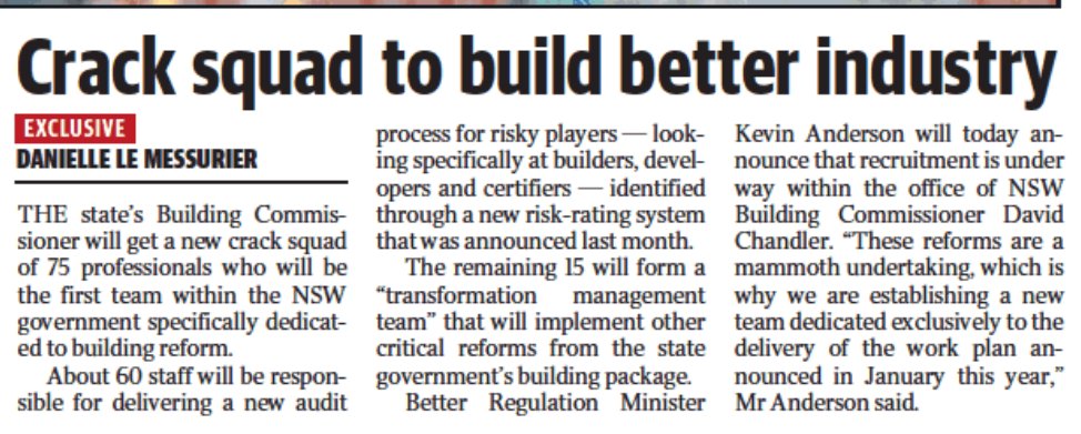 6 months after they appointed the commissioner the govt has finally recruited some building inspectors to work for him. Still no statutory independence, still a fraction of the workforce of the Qld and Vic Building Authorities.pic.twitter.com/k5lBhIdbsx
