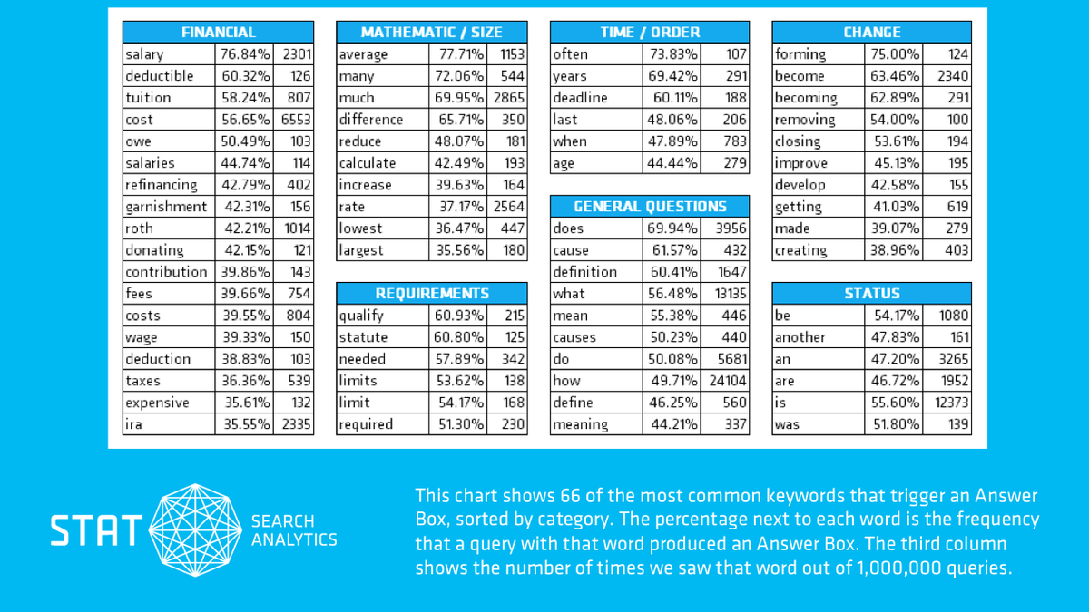 Which words trigger an Answer Box? Here's a preview from our upcoming study. Any Answer Box theories you'd test? pic.twitter.com/kSSSuMTY9R