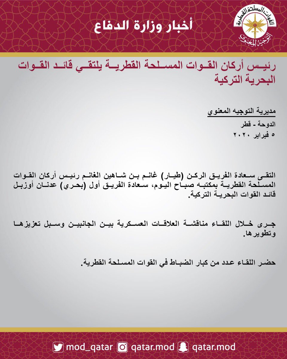 رئيس أركان القوات المسلحة القطرية يلتقي قائد القوات البحرية التركيةpic.twitter.com/mJ09HjyPFL