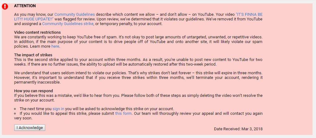 Dear @Youtube @TeamYouTube @YTCreators I am the owner of the YT channel SimLivNColor that has gained another guideline strike. I'm failing to understand how a 1 minute video of me just updating my audience on future plans deserved to be removed. I have appealed. Please fix this pic.twitter.com/GAyYufNDly