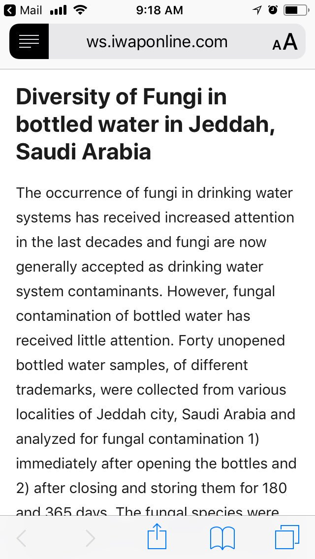 #أبحاث_بيئية وجدت دراسة أن ٥٨٪ من ٤٠ مياه معبأة ملوثة بفطر أو أكثر بعضها ممرضة. الدراسة قارنت بين عبوات مغلقة وأخرى بعد ١٨٠ و ٣٦٠ يوما من فتحها ثم غلقها، فلم يكن هناك فرق في التلوث، مما يرجح فرضية التلوث أثناء المعالجة#جدة#تلوث#مياه#بيئة https://goo.gl/szmHXQ pic.twitter.com/tCqKYNECUo