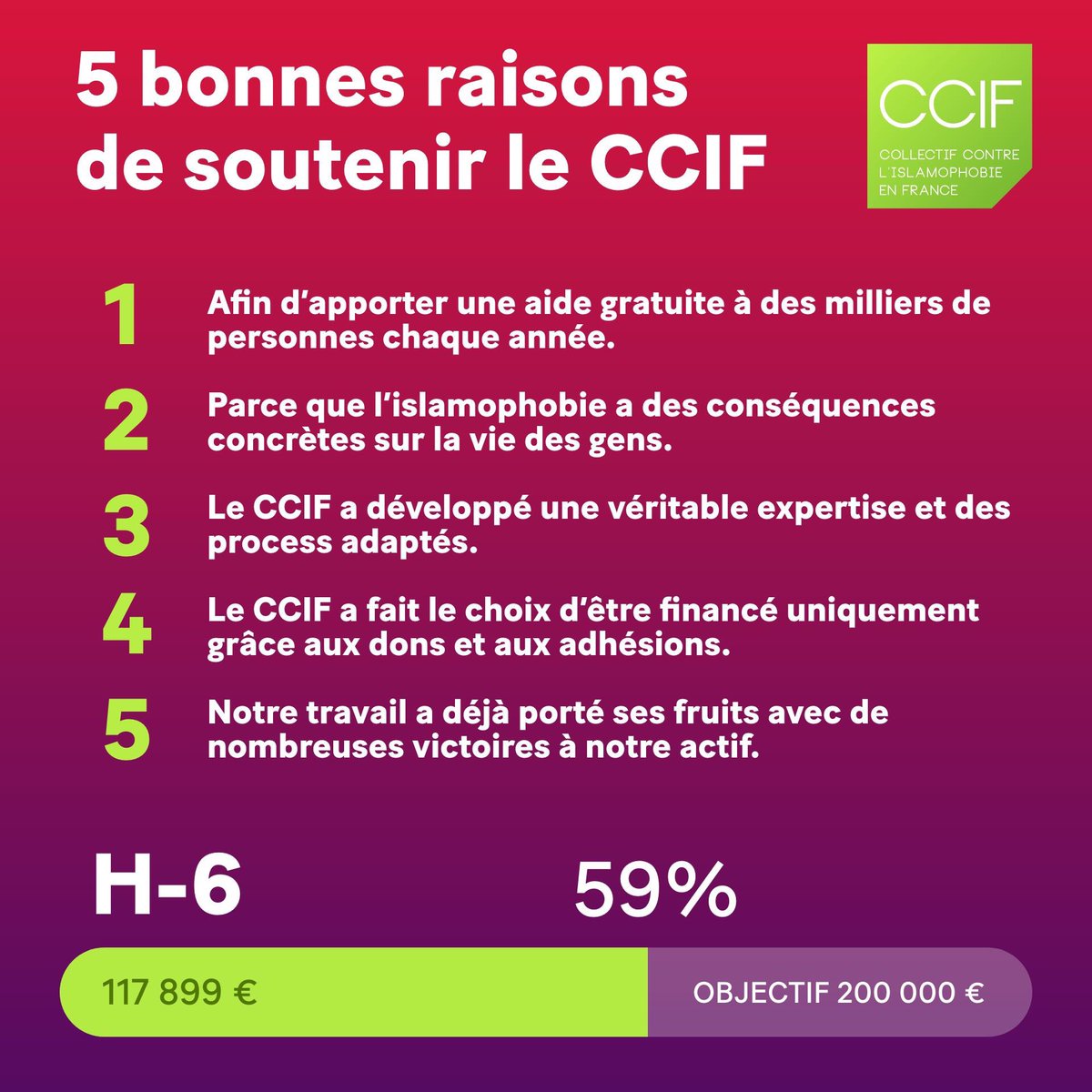 Plus que 6 heures avant minuit. Faites un don sur http://agir.islamophobie.net/don Presque 60% de l'objectif.