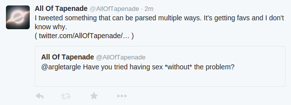 Whoa, nested tweets are tripping me out a bit. Do they go more than two deep? https://twitter.com/AllOfTapenade/status/583012928074432512 …pic.twitter.com/QslsqV0s4A