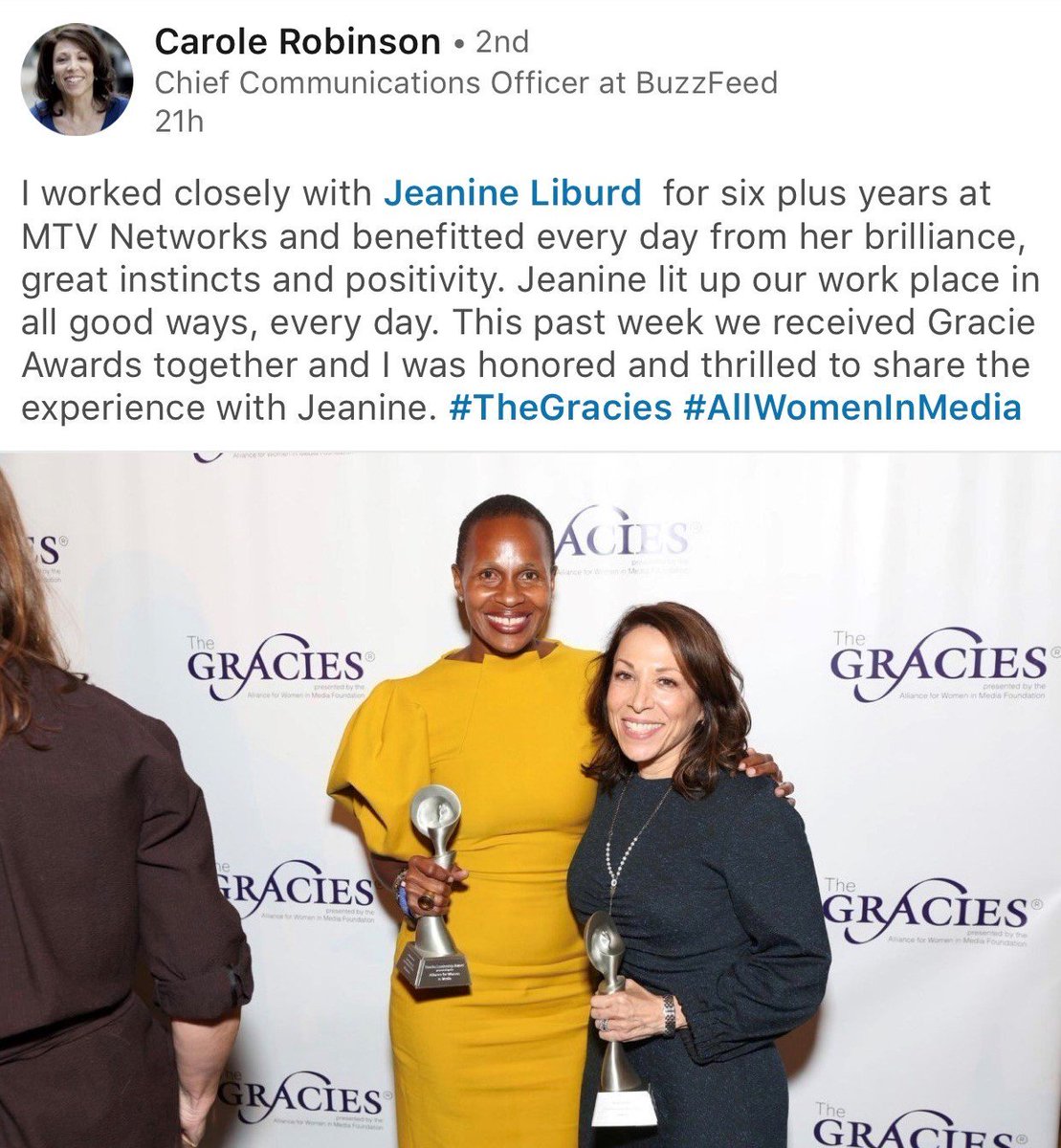 @BuzzFeed's first-ever CCO who today (alongside leading ladies from@BET@CBS@FOXSports@CNN and more) was honored with an@AllWomeninMedia#GracieLeadershipAward for her outstanding work in media. Congratulations, Carole!