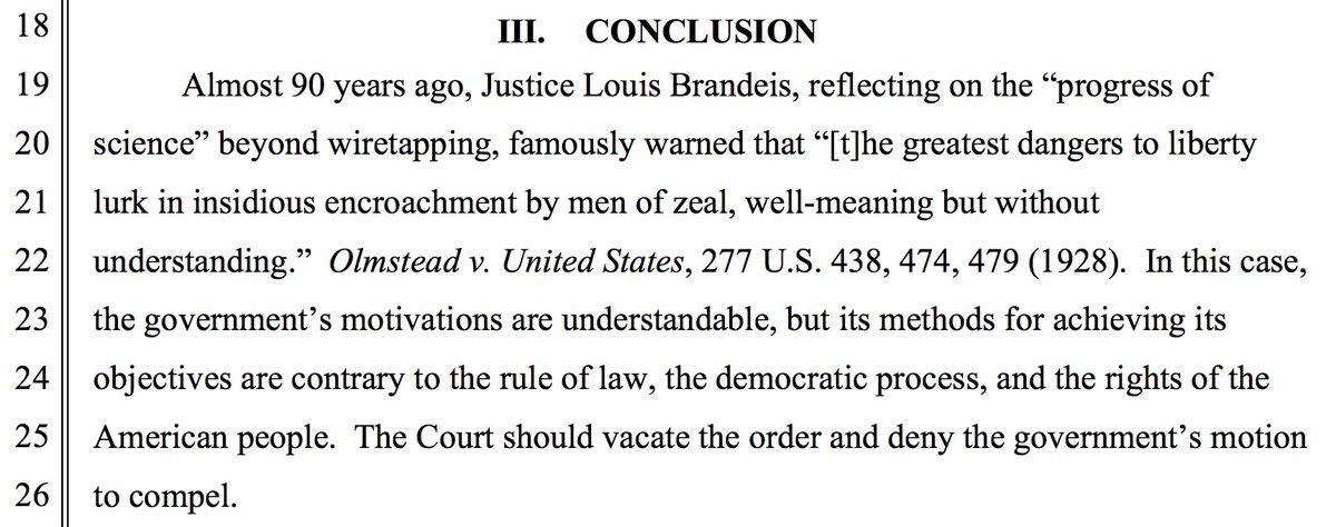Ballsy for Apple to close their brief with a quote from the dissent in Olmstead (first wiretapping case)pic.twitter.com/y4jpAGDu9O