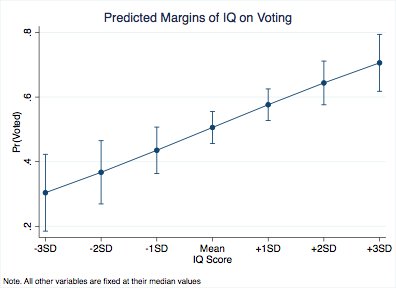 Even after controlling for education, income, parents + respondent political interest, IQ still has a strong influence on the probability of voting. Specifically, those with IQ's below (30%-43% chance) and above (58%-71% chance) the mean are increasingly less/more likely to vote pic.twitter.com/lgICjCBJRv