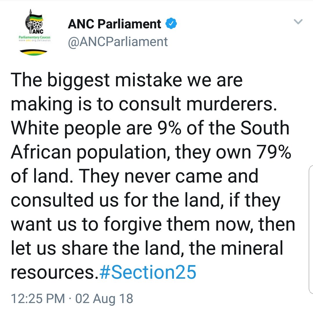 The official Twitter account of the ruling ANC party of South Africa refers to white South Africans as "murderers". And when white South Africans dare to speak up about this constant barrage of anti-white rhetoric, we're told to shut up and take it.pic.twitter.com/78PxiyD2FZ