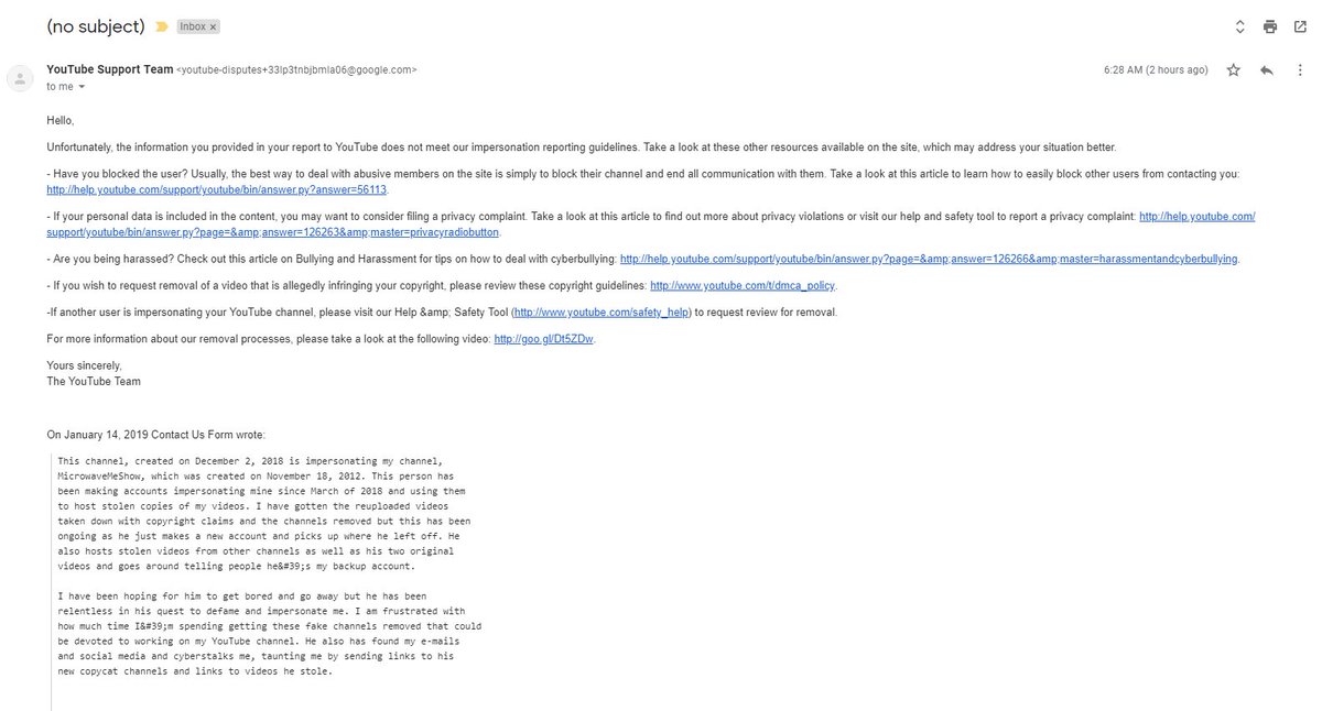 So, today I just got this wonderful little e-mail from @TeamYouTube telling me they don't think someone's account is impersonating me, even though I explained the situation and linked to the account. He steals my videos, comments on people's videos, claiming to be my new account.pic.twitter.com/QFBLNQaJuc