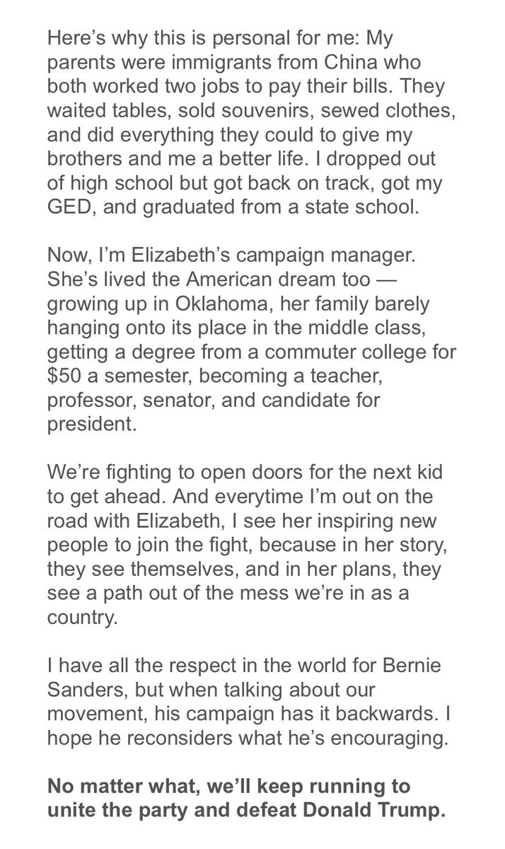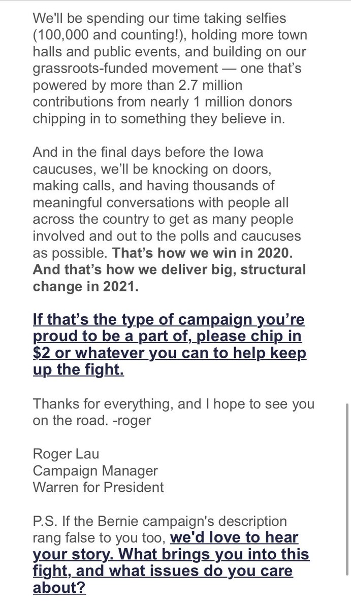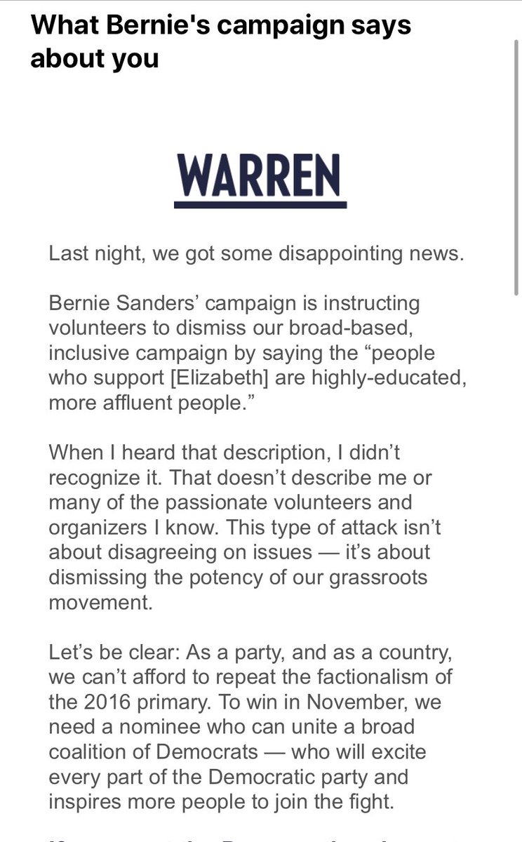 Warren leans in w/ email from campaign manager Roger Lau w/ subject “What Bernie's campaign says about you” “I have all the respect in the world for Bernie Sanders, but when talking about our movement, his campaign has it backwards. I hope he reconsiders what he’s encouraging.”pic.twitter.com/j5u6NM7vhE