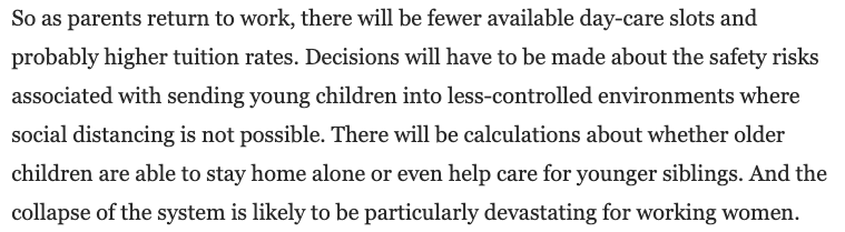 Terrifying story by @amandabecker on the coming child-care collapse: "Industry groups predict that one-third to half of child-care centers may not reopen at all." https://wapo.st/2TkjHFe pic.twitter.com/xKbjMPke4d