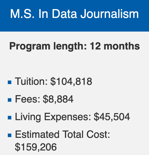 good lord: a master's degree in data journalism from columbia — a 12-month program at the gold standard for j-schools — will cost you wait for it you're not ready for this you literally will not believe it $159,206 how is this not a broken system https://journalism.columbia.edu/cost-attendance  pic.twitter.com/Svl3yT3MgE