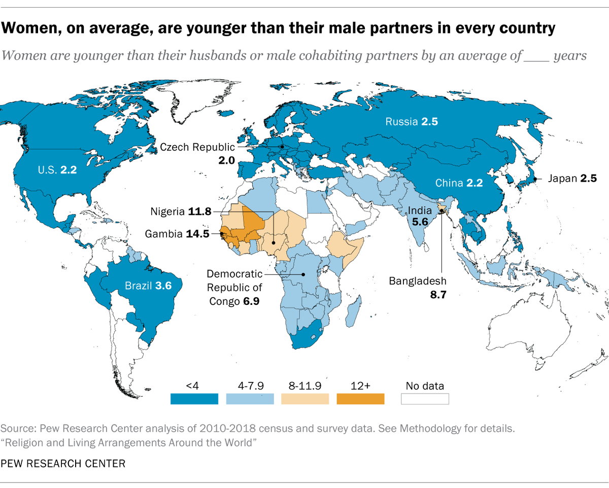 “De media, las mujeres son más jóvenes que sus maridos o parejas con las que conviven en los 6 grupos religiosos evaluados en el estudio y en los 130 países y territorios analizados”.https://twitter.com/FactTank/status/1213417044248535040 …