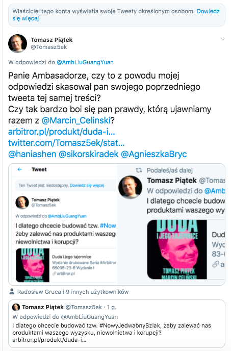 Ambasador Chin boi się kilku słów prawdy od polskiego dziennikarza. https://arbitror.pl/produkt/duda-i-jego-tajemnice/ … @haniashen @HannaGillPiatek @PawelWronskigw @katarynaaa @JNizinkiewicz @michalkobosko @SzJadczak @k_wlodkowska @Anna_Dryjanska @sikorskiradek @AgnieszkaBryc @IspKucharczyk @PiotrBuras1pic.twitter.com/YHyu7WDbMX