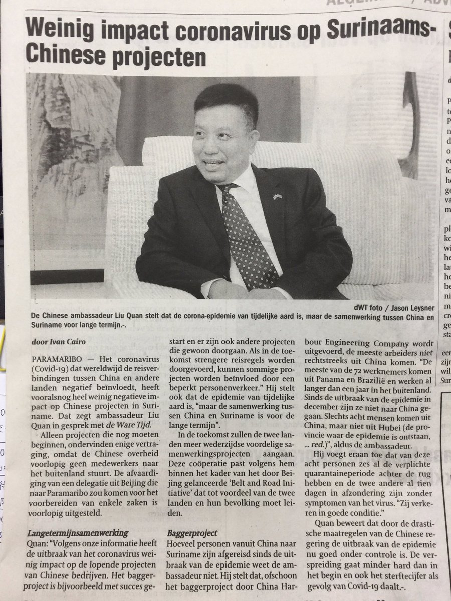 DWT published my interview with Mr. Ivan Cario. I shared with him the latest development about China's fight against the COVID 19 and China Suriname relations. By working together, we will win!pic.twitter.com/pwYU3NHIn1