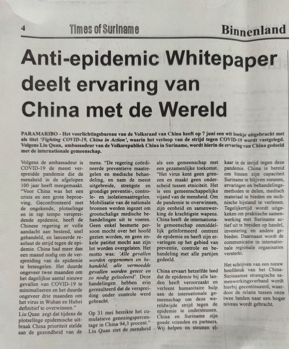 The Times of Suriname published my article about the White Paper Fighting Covid-19 China in Action. Together, we will defeat the Covid 19.pic.twitter.com/ihgaUNTsCX
