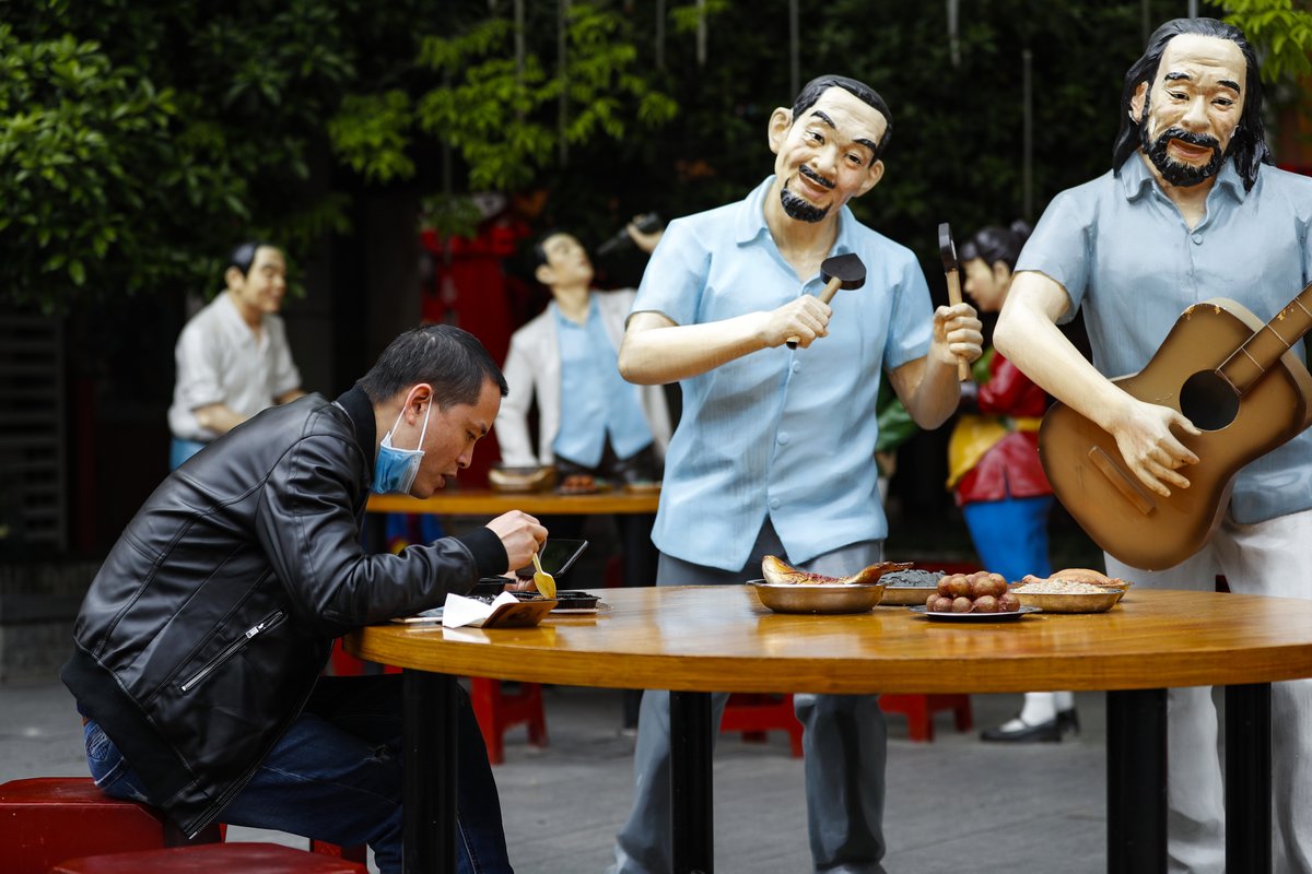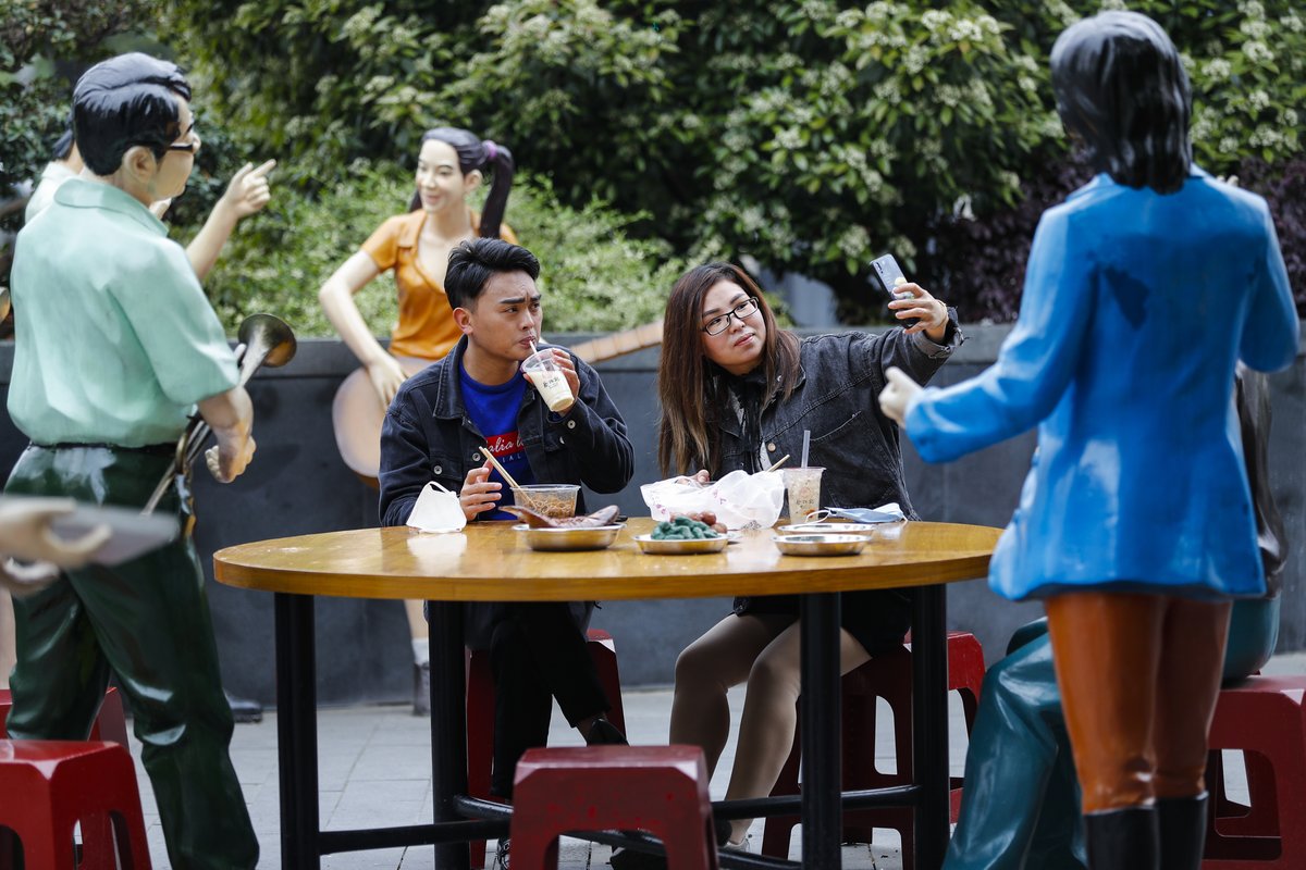 Des gens prennent leur repas à côté de statues dans un restaurant en plein air à Wuhan, dans la province chinoise du Hubei (centre), le 5 avril 2020. pic.twitter.com/FERpZm4IWP