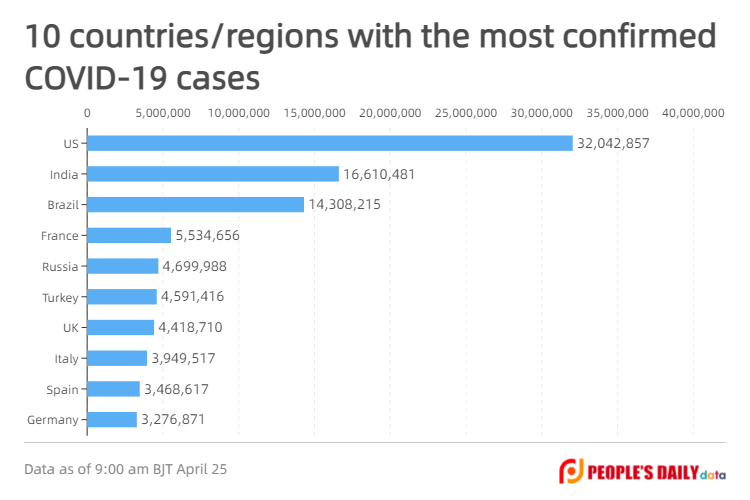 The total number of deaths from the #COVID19 pandemic worldwide has increased to 3,095,678 with the global confirmed cases reaching 146,071,230 as of 9:00 am BJT on Sunday, according to a tally by Johns Hopkins University. https://bit.ly/3erBJPL  pic.twitter.com/kVvk9h01YA
