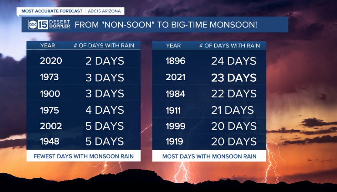 Phoenix went from a "non-soon" in 2020 to a wet and wild monsoon in 2021. Here's a look at our stats and what's driving these wild swings from extreme drought to extreme flooding: https://www.abc15.com/weather/impact-earth/monsoon-2021-brought-damaging-winds-heavy-rain-devastating-floods …