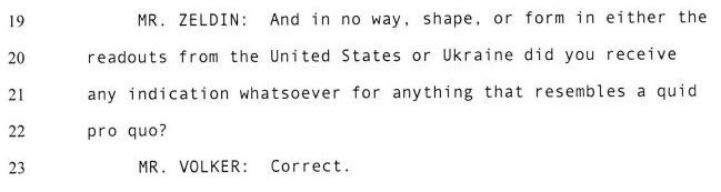 I asked Volker: And in no way, shape, or form in either the readouts from the United States or Ukraine did you receive any indication whatsoever for anything that resembles a quid pro quo? Volker: Correct pic.twitter.com/vdmJnSWPyo