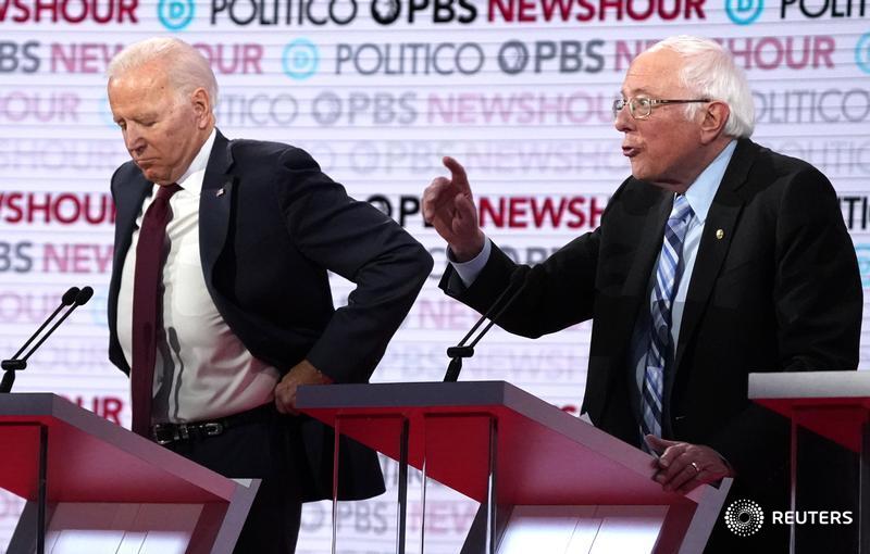 Joe Biden listens to Bernie Sanders during the #DemDebate in Los Angeles. More photos: https://reut.rs/2EDG1lC  📷 @mikeblake pic.twitter.com/oH3UTJdq9a