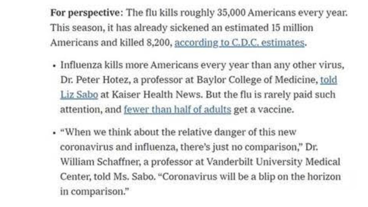 January 28, 2020: The Times compared the virus to the flu and included a quote for their readers that asserted coronavirus would be a “blip” in comparison.pic.twitter.com/8K6N3DoCsn