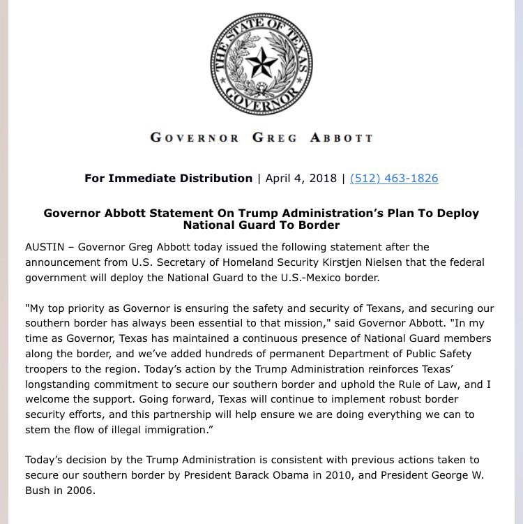 @GovAbbott Statement on @POTUS plan to deploy #NationalGuard to border. Texas will continue to implement robust #BorderSecurity efforts to ensure the safety & security of our citizens. #NationalDefense #NationalSecuritypic.twitter.com/3C1NbHyC8Y