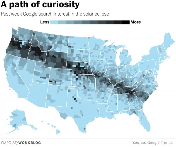 Map of Google searches for 'solar eclipse' beautifully mirrors the path of the eclipse itself. https://www.washingtonpost.com/amphtml/news/wonk/wp/2017/08/01/the-path-of-the-solar-eclipse-is-already-altering-real-world-behavior/ …pic.twitter.com/ZAAx1NxZd3