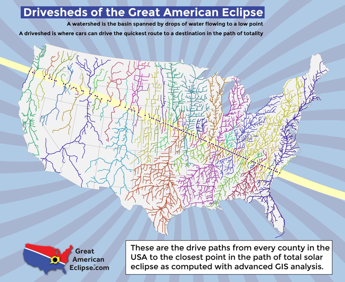 Drivesheds to the path of total solar eclipse! Details at https://www.greatamericaneclipse.com/statistics/ Built with