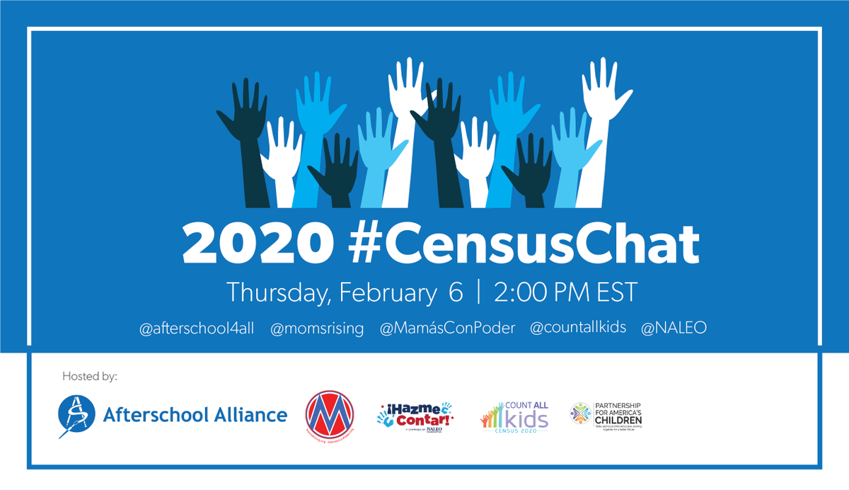 #2020Census. Together, we can make sure every kid is counted! Join the#2020CensusChat on Feb. 6 to discuss & share how we can all play a role!@afterschool4all@countallkids@NALEO@Momsrisingpic.twitter.com/105lvfUq9T