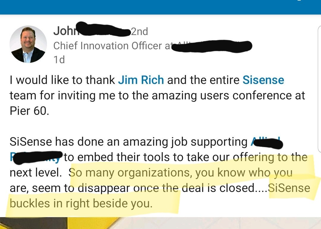 #WeCare. 100% of@Sisense customers recommended us in this research. Top scores in ease of use, responsiveness, value etc.https://twitter.com/BW_Technology/status/869905092568154112 …