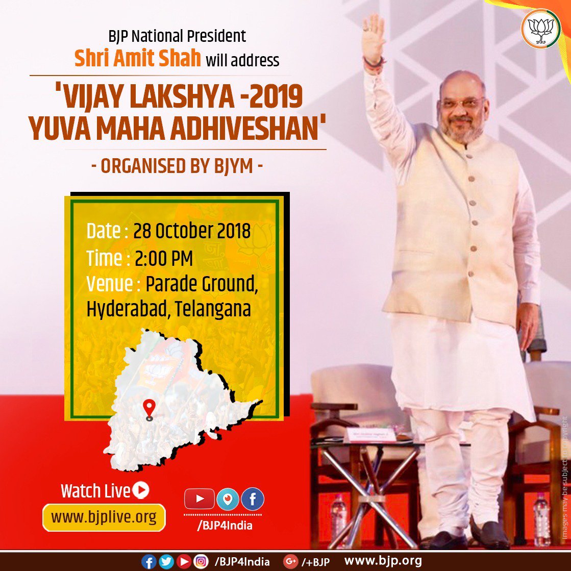Looking forward to addressing our young and enthusiastic @BJYM karyakartas at ‘Vijay Lakshya -2019, Yuva Maha Adhiveshan' on its concluding day in Hyderabad, Telangana.