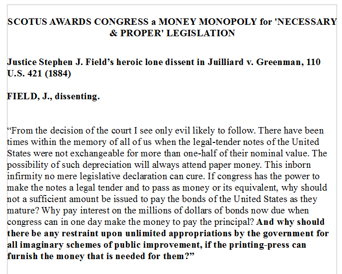 "Stage for state socialism was set in 1884 with Supreme Court sanction of government 'paper money' monopoly 'financing' "too-big-to-fail". "Only evil likely to follow!" https://www.law.cornell.edu/supremecourt/text/110/421 …pic.twitter.com/XQvXf1ChBM