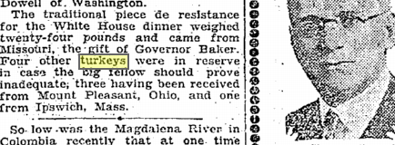 Coolidge did accept a turkey after first year, in '26 prez got a 24-pounder from Missouri Gov Sam Baker.#coolidgeclubpic.twitter.com/fu2O7SUHtz