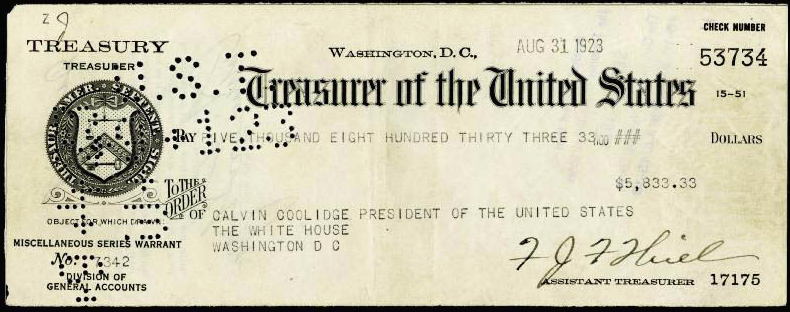 Calvin Coolidge's first check as US president, paid for the month of August 1923pic.twitter.com/PgJM5zkDCl