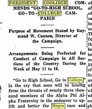 College = answer. Pres Coolidge worked through fraternities, here supporting #ALPHAPHIALPHA drive for black educationpic.twitter.com/oEKJjo2NDW