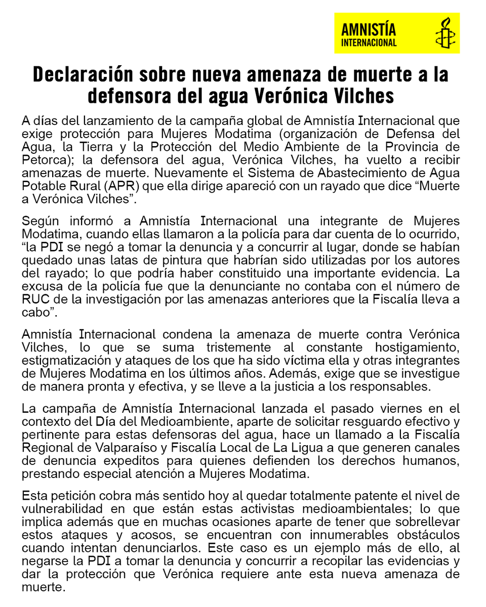No podemos esperar una tragedia entre las defensoras del agua de @MujeresModatima para que realmente se les proteja. Pedimos además a la@FiscaliaRegionV que genere canales de denuncia expeditos. EXIGE#ProtecciónMujeresModatima