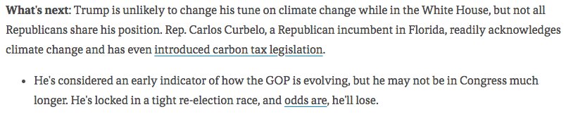 Trump is unlikely to change his tune on climate while in the White House, but not all Republicans share his position. Rep. Carlos Curbelo of Florida readily acknowledges climate change. He's projected to narrowly lose Tuesday. http://axios.link/B2TB pic.twitter.com/RYbXJKdQsF