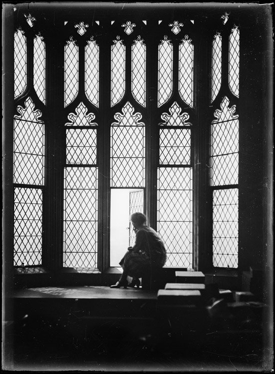 Woman looking out window, Anderson Stuart Building (also known as the Old Medical School), Sydney University, ca. 1920. Staff photographer