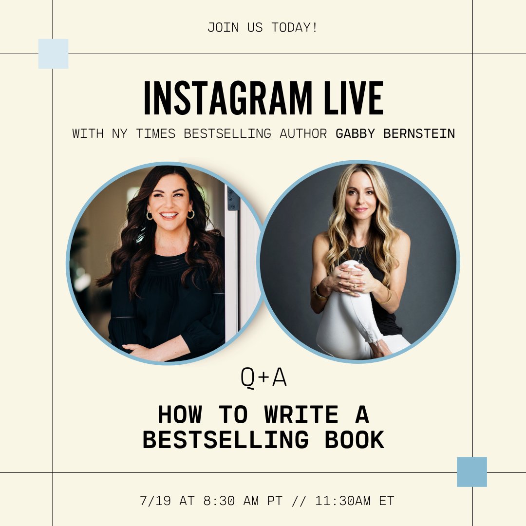 @GabbyBernstein and I on IG LIVE today 7/19 at 8:30am PT // 11:30am ET! We'll be sharing our experience and answering all your questions about How To Write A Bestselling Book